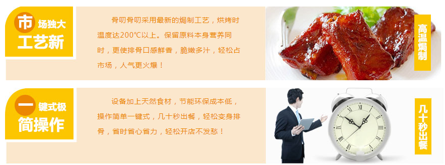 中国传统小吃众多,但其中当属排骨小吃最为受欢迎,它既保有肉的鲜嫩耐嚼,又带有骨头的营养醇香。据说,从前有个皇帝,十分喜好美食,这吃的多了,嘴就叼了,传统吃法无法满足,于是,就要求御厨换另一种吃法,并威胁道:“要是想不出来,我就把你扔到火堆里烧了你。”御厨吓坏了,心想:怎么办啊,这除了蒸就是炖,哪有别的吃法啊?苦思冥想,也没想出个所以然。此刻,已经万念俱灰,顺手将排骨扔进火里,“嗞啦”一声,点亮了他脑里的灵光:将炖和烤相结合!制成后,谁知口感极好,皇帝大称妙! 排骨小吃以其绝妙口感一直处于不败之地,但近几年,随着人们生活水平的提高,饮食习惯也发生了改变,传统排骨小吃已无法满足需求。焗骨小吃就在这种局面下出现了,它打破了传统制作工艺的困局,不仅制作时间短,而且更加注重营养成分的保留。香气袭人,色泽诱人,味道更是妙不可言! 骨叨骨叨采用最新的焗制工艺,外皮金黄酥脆,口感鲜嫩爽滑,汁香味浓,香飘万里,很快风靡大街小巷,人人追捧,到处都是长长的等候队伍,迅速成为国内小吃行业的佼佼者。